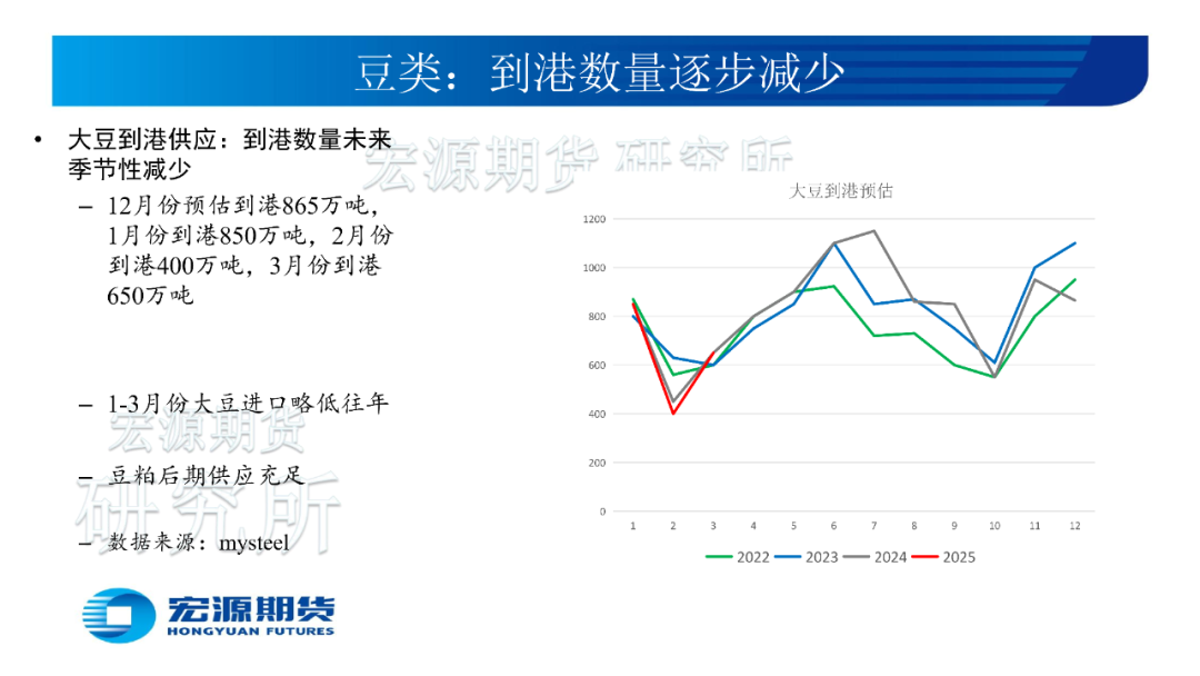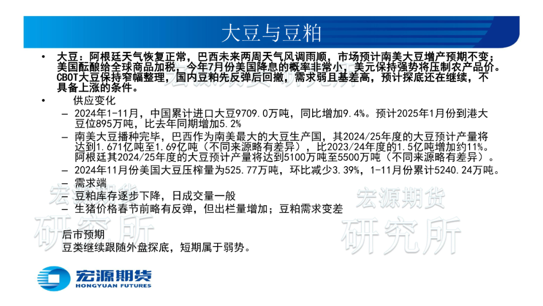 – 2024年1-11月,中国累计进口大豆9709.0万吨,同比增加9.4%。预计2025年1月份到港大