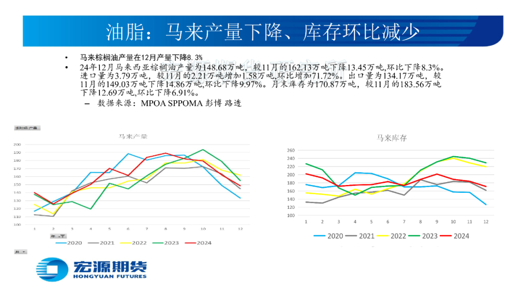 马来西亚棕榈油协会(MPOA)称,24年12月马来西亚棕榈油产量为148.68万吨,较11月的162.13万吨下降13.45万吨,环比下降8.3%。进口量为3.79万吨,较11月的2.21万吨增加1.58万吨,环比增加71.72%。出口量为134.17万吨,较11月的149.03万吨下降14.86万吨,环比下降9.97%。月末库存为170.87万吨,较11月的183.56万吨下降12.69万吨,环比下降6.91%。
