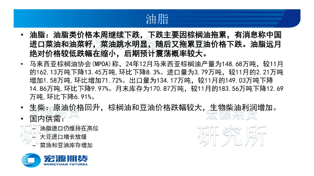 油脂类价格本周继续下跌,下跌主要因棕榈油拖累,有消息称中国进口菜油和油菜籽,菜油跳水明显,随后又拖累豆油价格下跌。油脂远月绝对价格较低跌幅在缩小,后期预计震荡概率较大。