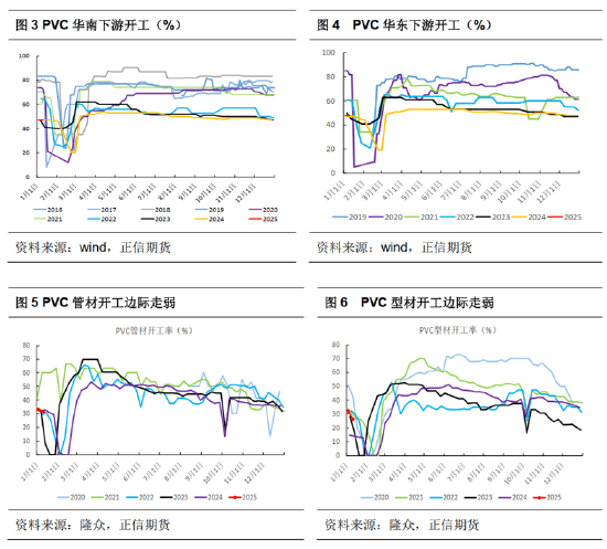 从内需看,近两年硬质品如管材型材等依旧受到地产的拖累;部分软制品订单比如薄膜、地板膜虽有改善,但这部分需求占比有限。短期来看,随着春节假期临近影响,管型材开工将面临回落,春节期间下游开工将进入年内最低水平。中期来看,管材企业生产以销定产;型材企业则受房地产低迷、塑钢替代影响,未来仍需关注地产端表现。
