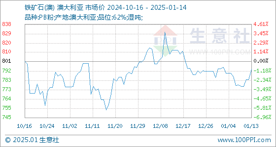 1月14日生意社铁矿石(澳)基准价为794.11元/吨