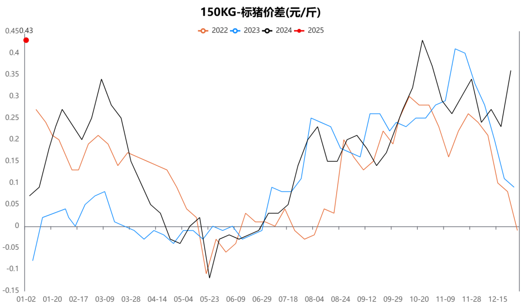 涌益咨询数据显示,冬至后生猪出栏体重迅速下降,1月2日当周生猪出栏体重降至126.06公斤,较冬至前出栏体重下降4.62公斤,大体重猪已得到较为充分的消化,打破“部分大猪出栏压力延至春节后”的预期。这一点从肥标价差也可很容易的看出,以150Kg与标猪价差为例,冬至后肥标价差持续走强,说明肥猪供应已由宽平衡转为紧平衡。在肥标差走强的刺激下,也刺激养殖端放缓出栏节奏,部分地区又有二育进场和压栏增重现象,进一步助推猪价走强。不过此部分供应后移并不构成2503合约的利空,原因在于:①规模有限;②基本上还都打算春节前“能出都出,该出尽出”。