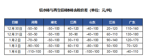 1月6日A00铝锭现货价华东19630,跌220;华南19760,跌240;中原19560,跌200(单位:元/吨)。需求走弱,铝价大幅回落,再生棒价格受成本端支撑,含税价格相比铝水棒依旧相对坚挺,棒厂积极调价出货为主,今日再生铝棒价格下跌100元/吨。