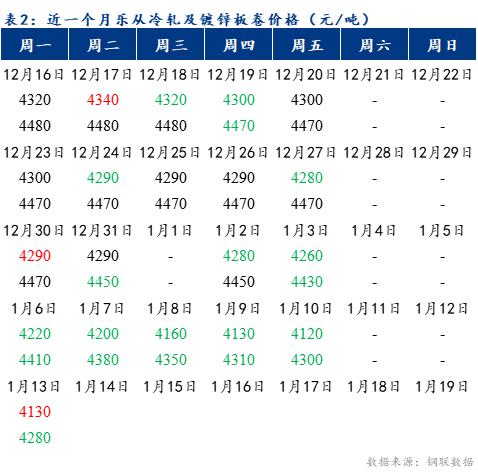 截止2025年1月13日17:30,冷轧板卷月均价为4259元/吨,镀锌板卷月均价为4430元/吨。