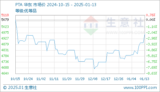 据生意社监测,PTA01月13日最新价格4963.89元/吨,最近5天上涨3.33%。