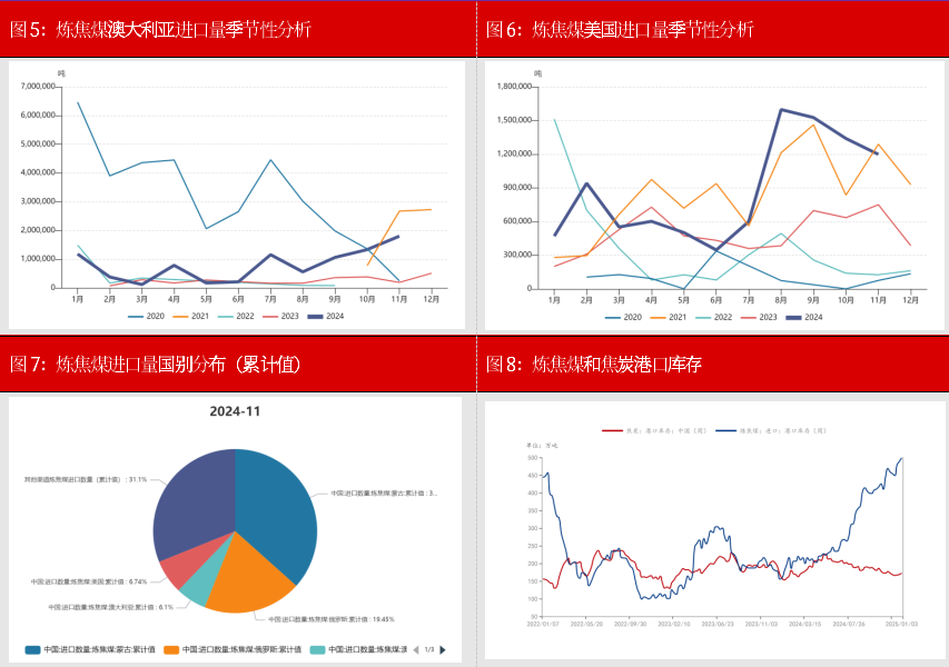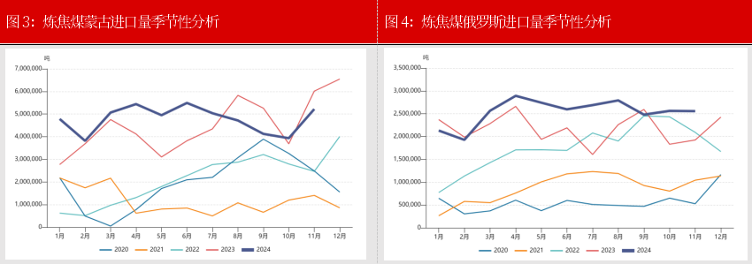 2024全年内矿煤产能释放因安监、环保等检查同比往年偏低,产量前紧后松,同比增速小幅下滑,但炼焦煤全年供应量仍偏高,主要原因是同比往年走强的进口煤增量。