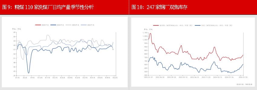 下游需求因钢材产能过剩而疲软,港口库存积压。临近冬储时节,为了满足全年生产指标,四季度洗煤厂日均产量有所提升。