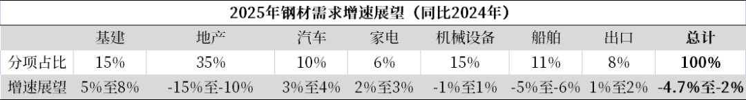 整体来看,根据国金期货研究所测算,2025年钢材需求增速同比或仍为负,大致区间为-4.7%至-2%。