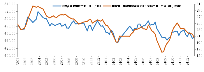 在成材品种间,2024年螺纹钢产量的增速明显弱于热轧卷板及其他出口较好的非主流钢材。