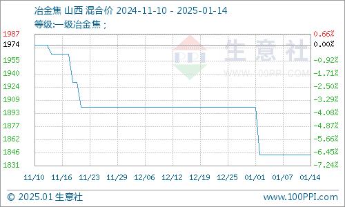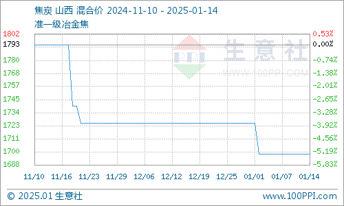 据生意社商品行情分析系统:2025年1月14日山西地区焦炭市场持稳运行,均价是1698.33元/吨,山西地区冶金焦价格下行,均价是1844元/吨,目前焦炭市场价格持稳运行。