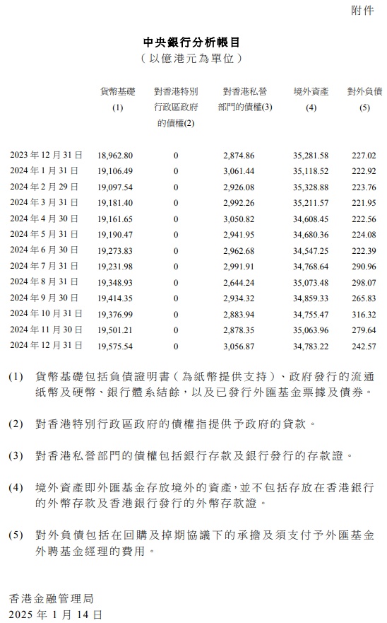 1月14日,香港金融管理局公布外汇基金在2024年12月底的主要分析帐目。12月份,外汇基金的境外资产减少281亿港元,至34,783亿港元。货币基础为19,576亿港元,包括负债证明书、政府发行的流通纸币及硬币、银行体系结余,以及已发行外汇基金票据及债券。外汇基金对香港私营部门的债权总额为3,057亿港元。对外负债总额为243亿港元。