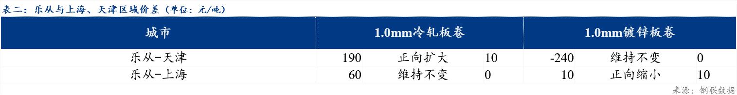 今日冷轧板卷乐从与天津价差较上一交易日扩大10元/吨,乐从与上海价差较上一交易日持平;镀锌板卷乐从与天津价差较上一交易日持平,与上海价差较上一交易日收窄10元/吨。品种价差方面,镀冷价差较上一交易日收窄10元/吨,镀热价差较上一交易日收窄40元/吨,冷热价差较上一交易日收窄30元/吨。