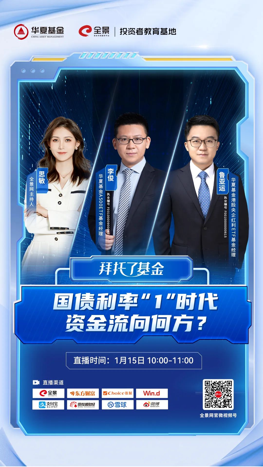 1月15日上午十点,《拜托了基金》系列直播邀请到了华夏基金港股央企红利ETF基金经理鲁亚运、华夏基金A500ETF基金经理李俊,一起探讨《国债利率“1”时代,资金流向何方?》,敬请关注。