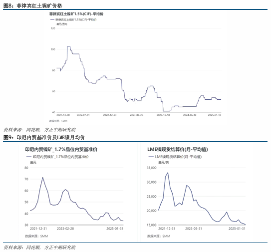 2024年末,2025年初,印尼收紧镍矿配额消息时有发出,政府表态频繁,甚至一度有外媒报道2025年配额削减至1.5亿吨,市场普遍质疑。目前印尼公布了已批准的项目的具体数量,以及批准的镍矿配额数量2亿吨,相对可信度有所加强。而这个数据意味着,印尼在产产能无法通过印尼本土镍矿得到满足,印尼仍可能需要进口。而菲律宾镍矿石尚处供应淡季,价格高企,较难回落,继续在矿端形成支持。矿端供应偏紧预期仍可能对镍价形成较强支持。