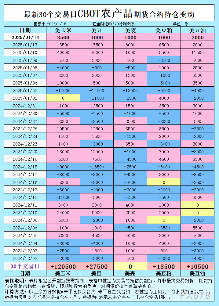 汇通财经APP讯——周三(1月15日),CBOT谷物期货市场呈现分化格局。玉米和大豆在此前价格上涨后因农户现货销售的增加而出现回调,小麦期货则小幅上涨。在最新美国农业部(USDA)报告引发的供应趋紧预期推动下,近期市场经历了显著波动。同时,全球贸易动态和基差调整进一步影响了市场情绪。值得注意的是,大宗商品基金在近阶段持续增持主要谷物品种的投机性净多头,这为市场提供了一定的支撑。