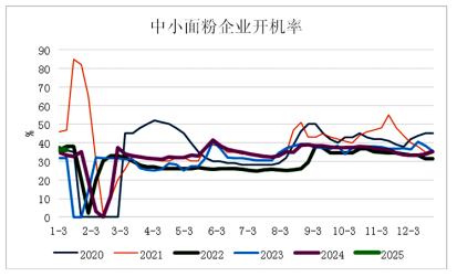 上周中小制粉企业开机率依旧不高,企业库存压力延续高位。主产区河北、山东、河南、安徽、江苏中小企业开机率分别在33.57%、36.41%、35.59%、38.25%、37.67%,平均开机率36.3%,周环比持平,同比增加1.5%。