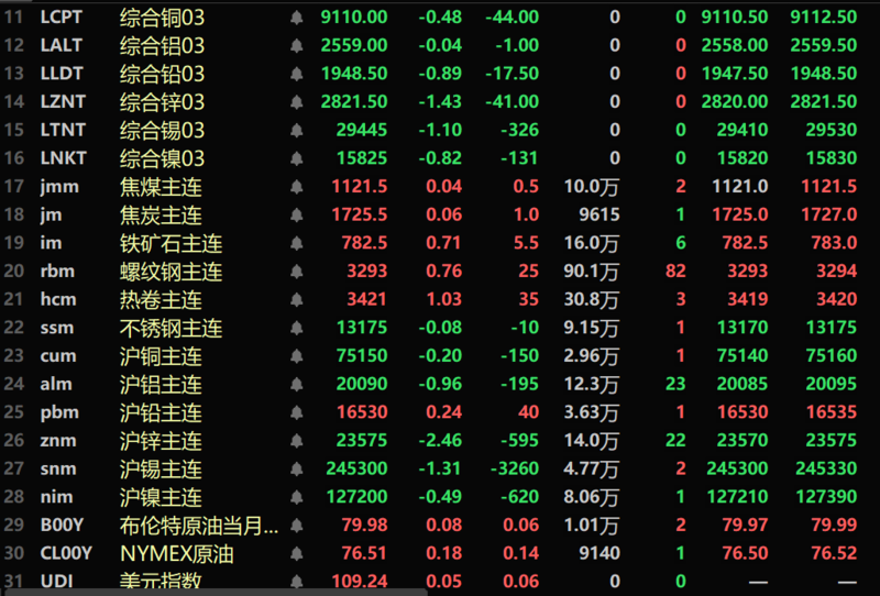 黑色系多飘红,铁矿涨0.71%,螺纹、热卷分别涨0.76%、1.03%,不锈钢微跌。双焦方面,焦煤、焦炭微涨。