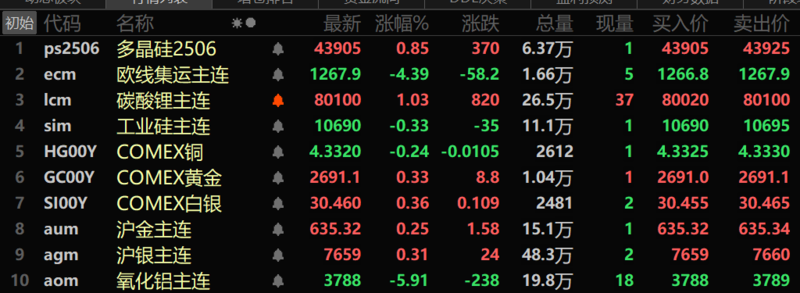 此外,氧化铝跌5.91%。碳酸锂涨1.03%,工业硅跌0.33%。多晶硅主力期货涨0.85%。