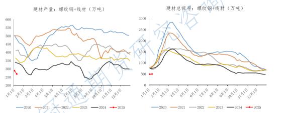 本期五大材供需双降,需求下降速度快于供应下降速度,五大材累库态势延续。其中,螺纹供应低位继续下降,减量主要来自长流程、短流程产量小幅波动,近期高炉检修力度加大,淡季阶段螺纹产量低位运行为主。需求春节前季节性回落,本期螺纹连续第二周累库,库存绝对水平偏低。