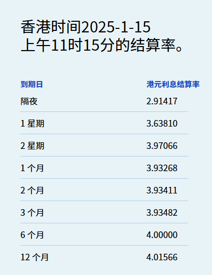 1月15日,港元拆息普遍向下,其中,隔夜息低见2.91417%,为去年9月17日以来最低,而与楼按相关的一个月拆息亦连跌六天,报3.93268%,为去年9月23日后最低。