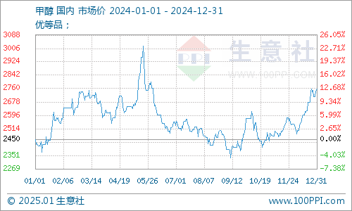 2024年第四季度,国内甲醇市场价格宽幅上移,在宏观利好释放,进口船货抵港量减少以及内地市场供应压力不大的支撑下,市场价格整体呈现震荡向上的走势。国庆假期归来以后,甲醇主力合约期价在原油拉涨以及宏观利好的刺激下大幅拉涨,但随着价格的上调,下游行业利润被压缩,市场成交气氛迅速降温。11月份以后,国际部分地区装置受天然气限气影响,进口船货存一定缩减预期,受此提振甲醇主力期盘持续偏强震荡,加之西北地区部分烯烃工厂持续外采,主产区各厂家出货相对顺畅,供应压力不大的支撑下市场报价走高,甲醇市场整体价格以上涨为主。