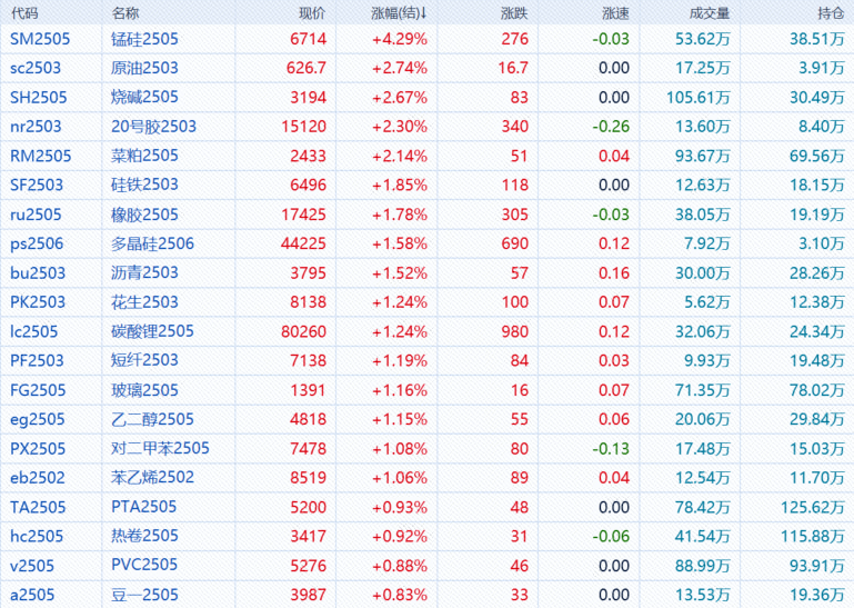 1月15日,午盘收盘,国内期货主力合约涨跌不一。锰硅涨超4%,SC原油、烧碱、20号胶、菜粕涨超2%,硅铁、橡胶涨近2%;跌幅方面,集运欧线跌超7%,氧化铝跌超5%,棕榈油、沪锌、白糖跌超2%,沪锡、燃料油跌超1%。