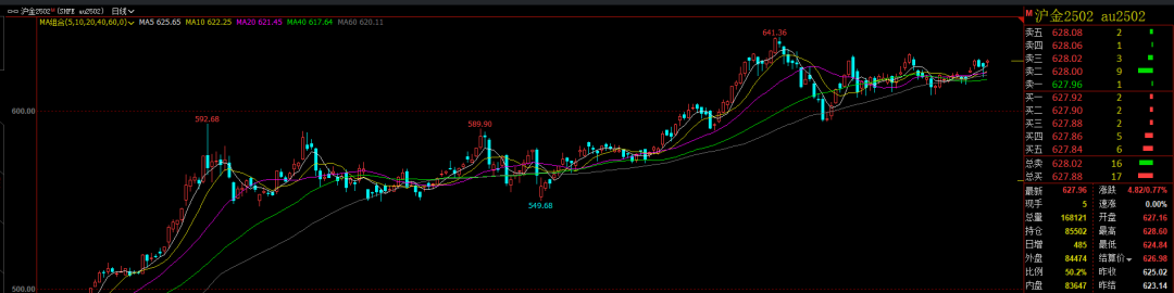 沪金期货2502主力合约周三高位震荡,最高点628.6元/克,最低点624.84元/克,最终收盘在627.96元/克,全天收涨2.94元/克或0.47%。