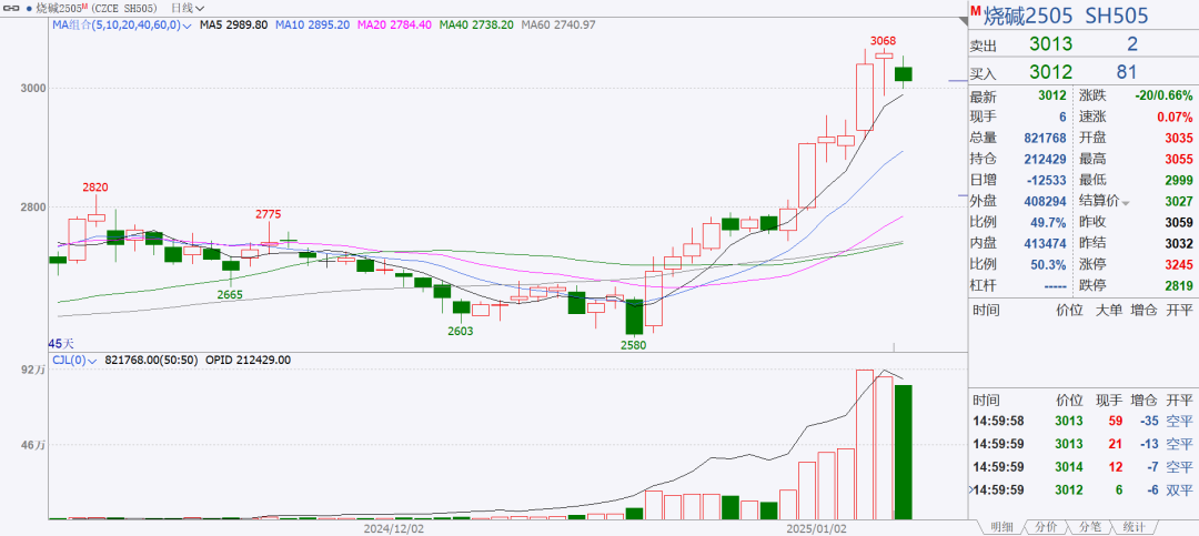 期货端,烧碱主力合约结束6连阳,今日收阴线,收盘价3012元/吨,下跌20元/吨(-0.66%),最高3055元/吨,最低2999元/吨,日内持仓量减少12533手。