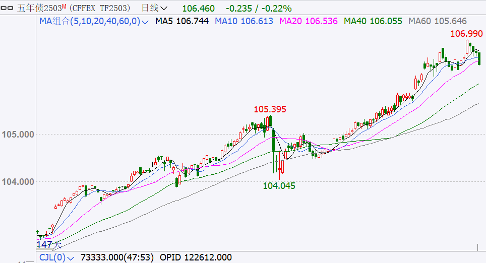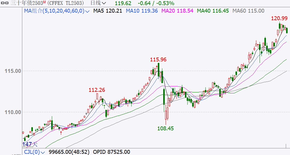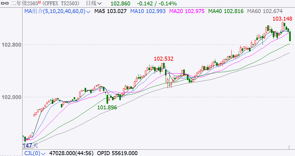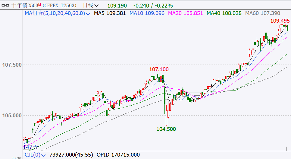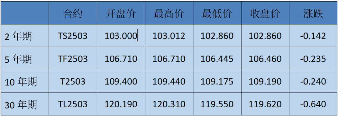 1月09日,国债期货:TS2503-0.14%收至102.860,TF2503-0.22%收至106.460,T2503-0.22%收至109.190,TL2503-0.53%收至119.620。