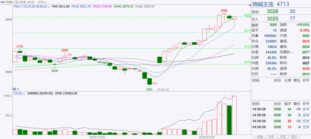 今日烧碱主力合约价格先跌后升,重新站上3000元/吨整数关口,夜盘多头止盈离场,盘中一度跌超3%,早盘开盘后再次增仓上行,日线再次站上20日均线。