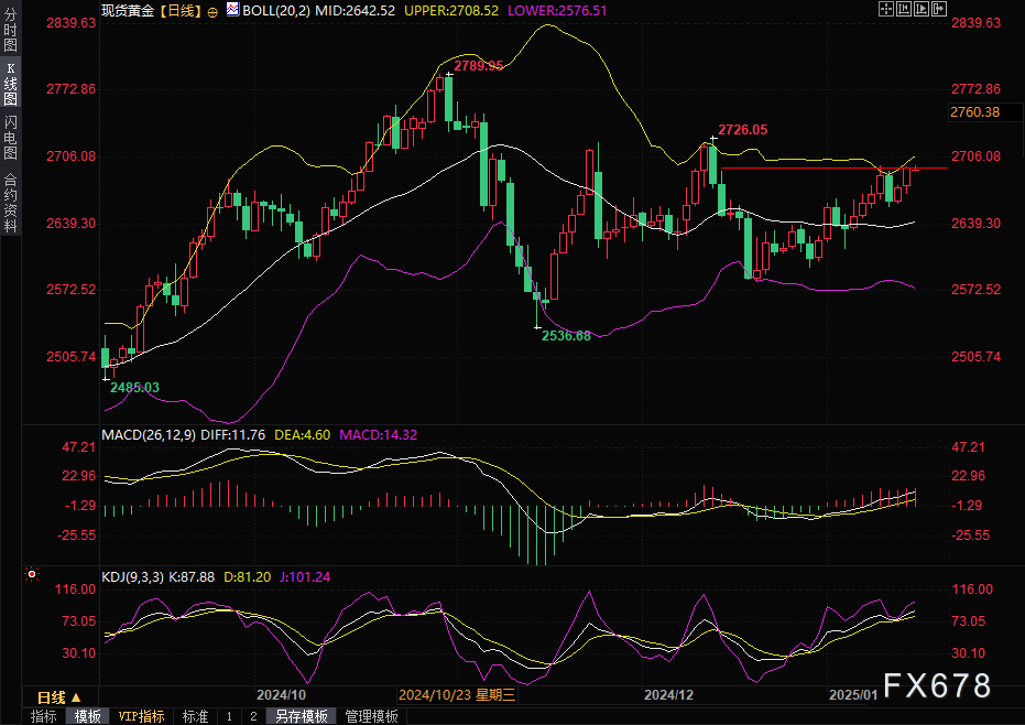 尽管加沙达成停火协议一度令金价回吐涨幅,但逢低买盘帮助金价收涨0.72%,逼近2700关口。