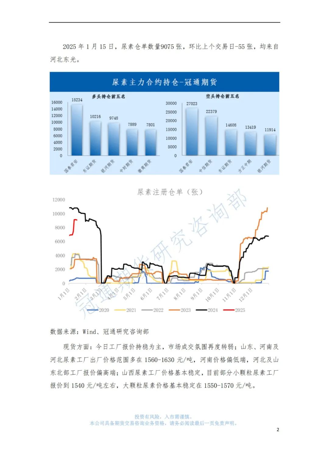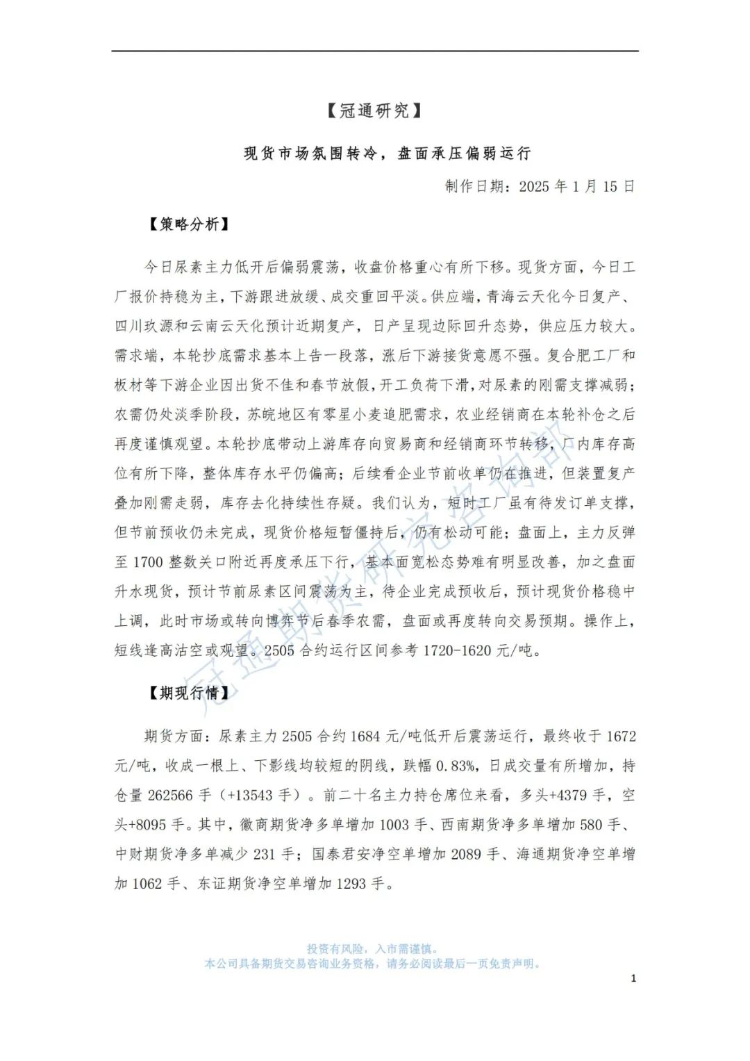冠通研究--尿素策略:现货市场氛围转冷,盘面承压偏弱运行