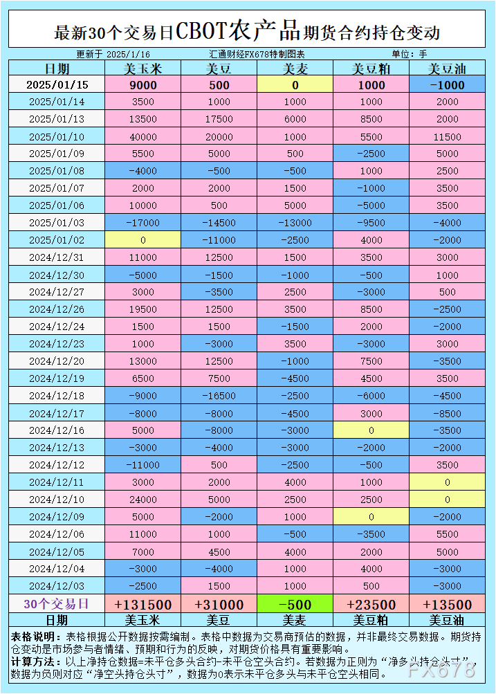 汇通财经APP讯——北京时间周四(1月16日),芝加哥期货交易所(CBOT)的谷物期货市场维持在较高的价格区间,但持仓结构的变化显著影响了市场情绪。小麦和大豆期货在近期报告发布后呈现出一定波动,而玉米期货则表现出与其他谷物品种相反的逆势走势。值得注意的是,市场情绪变得愈发谨慎,特别是在美麦和美豆油的持仓结构上出现了显著变化。