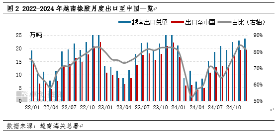 2024年越南橡胶累计出口中国同比下滑15.09%