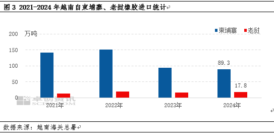 12月份越南橡胶进口量为22.97万吨,环比增长18.06%,同比增加10.37%;2024年累计进口橡胶约191.51万吨,同比增加8.5%。越南橡胶进口来源国,主要以柬埔寨、老挝为主,整体占比超80%。而进口胶种则主要以10#胶原料为主,而越南国内胶水主要用于生产越南乳胶及3L为主。据越南海关数据显示,2024年越南自柬埔寨进口天然橡胶累计进口89.27万吨,同比减少5.84%;越南自老挝进口天然橡胶累计进口17.76万吨,同比增长3.39%。而支撑进口体量实现增长的核心在于鞋企、轮胎企业等本土企业原料刚需提升的支撑,其中包括部分轮胎厂对于泰国20#胶的采购需求。