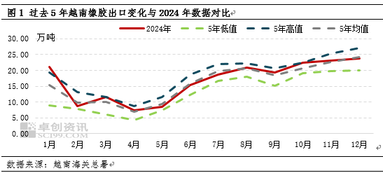 越南海关最新公布的数据显示,12月份越南橡胶出口总量为23.8万吨,环比增加3.22%,同比减少11.45%;2024年越南累计橡胶出口总量约200.9万吨,同比减少13.27万吨,跌幅6.2%。从图中可以看出,2024年整体来看越南橡胶出口基本维持在过去5年均值水平震荡为主,10月旺产季支撑越南橡胶产出一度创出历史同期最高水平。但由于年内前期降雨偏多,导致二、三季度越南橡胶出口呈现持续同比走弱形态;同时年内生产加工利润缺乏以及内外盘倒挂导致进口意愿不强,加之随着下游企业产能投放,橡胶原料本土消化份额提升,综合影响下导致2024年越南橡胶总体出口同比呈现下滑趋势。