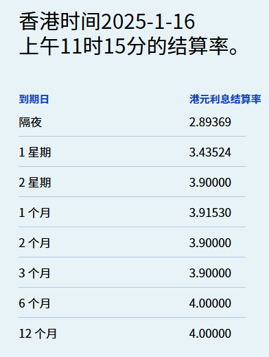 1月16日,港元拆息普遍向下,其中,隔夜息微跌2基点至2.89369%,创近四个月新低,而与楼按相关的一个月拆息亦连跌七天,报3.9153%,续见去年9月23日后最低。