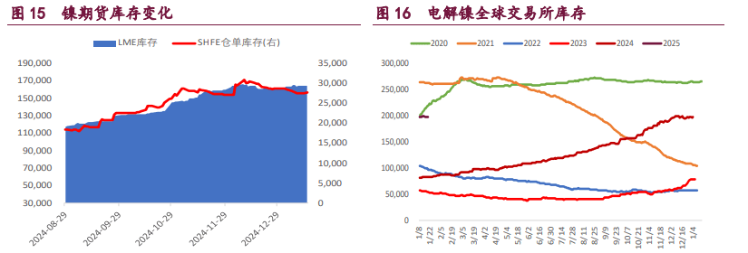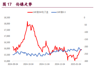 1 月 15 日,精炼镍上海市场主流参考合约沪镍 2502 合约。金川电解主流升贴水+2700 元/吨,价格 130480 元/吨;俄罗斯镍主流升贴水-100 元/吨,价格 127680 元/吨;挪威镍主流升贴水+3550 元/吨,价格 131330 元/吨;镍豆主流升贴水-900 元/吨,价格 126880 元/吨。