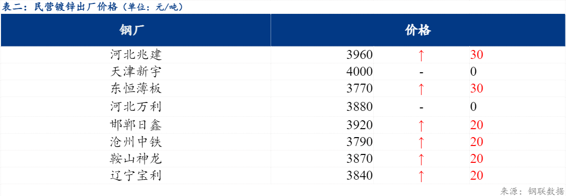 今日北方民营钢厂镀锌出厂指导价在3770元/吨-3400元/吨。