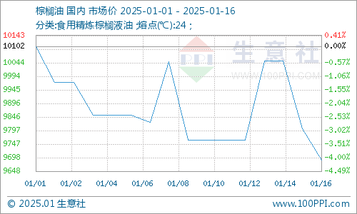 据生意社商品行情分析系统显示:1月上半月国内棕榈油振荡下跌,跌幅超4%。月初,棕榈油市场均价10102元/吨,1月16日,棕榈油市场均价9690元/吨,价格下跌4.08%。