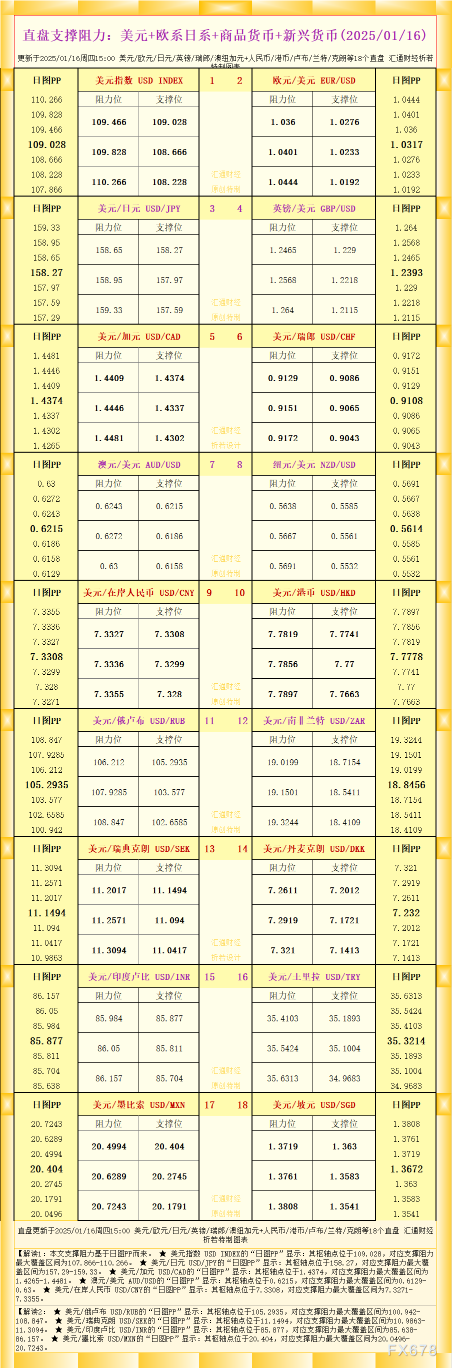 一张图看18个直盘外汇支撑阻力:美元+欧系日系+商品货币+新兴货币(2025/01/16)