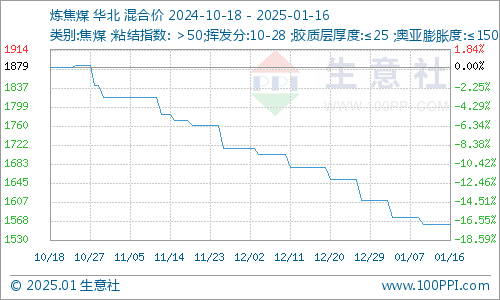 1月炼焦煤市场不断下跌,跌幅每吨在50元-100元左右,整体偏弱运行。据生意社监测系统显示,截止1月16日,生意社炼焦煤价格指数在1562.25元/吨,较月初下降-2.95%。