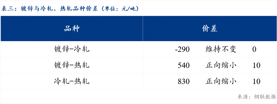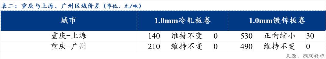 重庆、上海地区冷轧板卷区域价差维持不变,重庆、广州冷轧板卷区域价差维持不变;重庆、上海镀锌板卷区域价差缩小30元/吨,重庆、广州镀锌板卷区域价差维持不变。镀锌、冷轧品种价差维持不变;镀锌、热轧品种价差缩小10元/吨;冷轧、热轧品种价差缩小10元/吨。