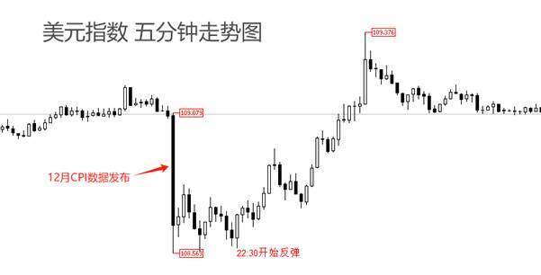美国12月CPI数据公布后,美元指数五分钟级别剧烈下跌。具体来看,数据公布之前,五分钟级别先形成小阴K线。数据公布后,行情剧烈下跌,从最高点109.079跌至108.563,一举突破109整数关口。如果交易员在这段时间操作黄金,可以获得最大9美金/盎司(2690~2681)的利,润空间;如果操作EURUSD,可以获得5.3美元/千美元(1.0300~1.0353)的利,润空间。当然,交易策略往往具有滞后性,实际的利,润空间往往偏小。