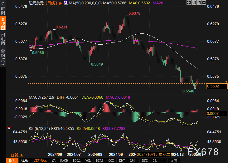 从技术面来看,纽元在当前水平的表现符合此前的预期。根据技术分析,纽元兑美元的短期交易区间仍在0.5600至0.5650之间,这一范围已成为市场关注的焦点。技术指标显示,纽元需要突破0.5650并稳定在该水平之上,才能为进一步上涨打开空间。在这一过程中,0.5580的支撑位起到了较强的支撑作用,短期内若跌破该水平,可能会加剧下行压力。