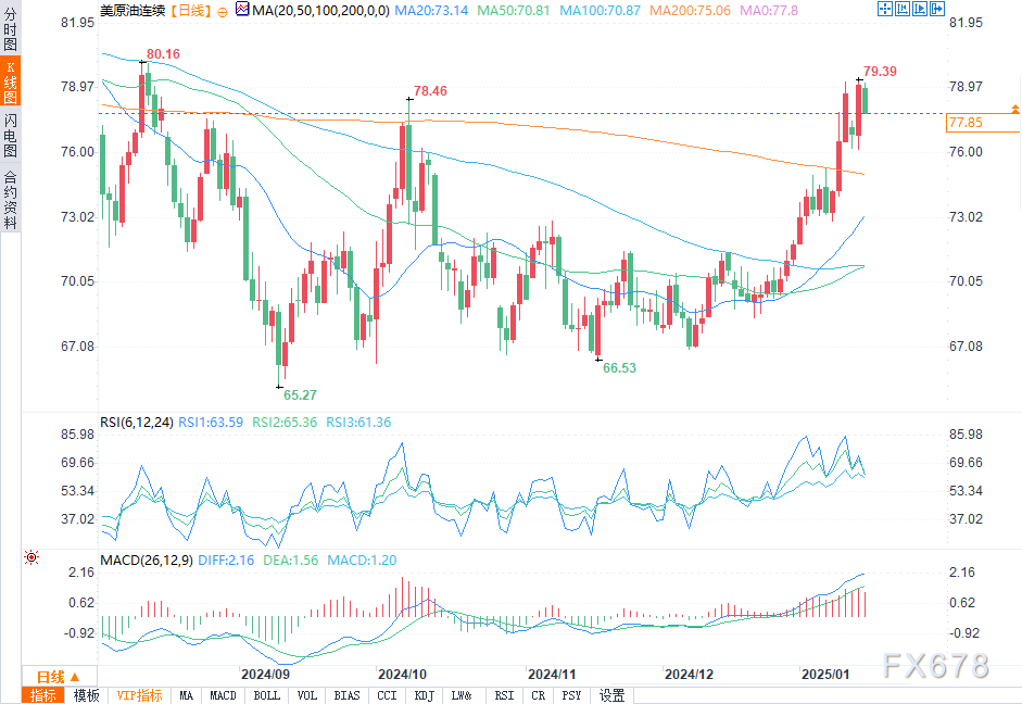 下行方面,首个主要支撑位在76.85美元附近。若日收盘价低于76.85美元,可能引发更大幅度的下跌。下一个主要支撑位是75.35美元以及趋势线位置。若进一步下跌,未来几天油价可能跌至72.00美元。