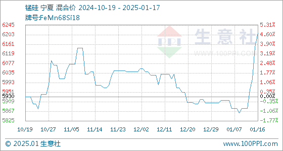 1月17日,生意社锰硅基准价为6210.00元/吨,与本月初(5904.00元/吨)相比,上涨了5.18%。