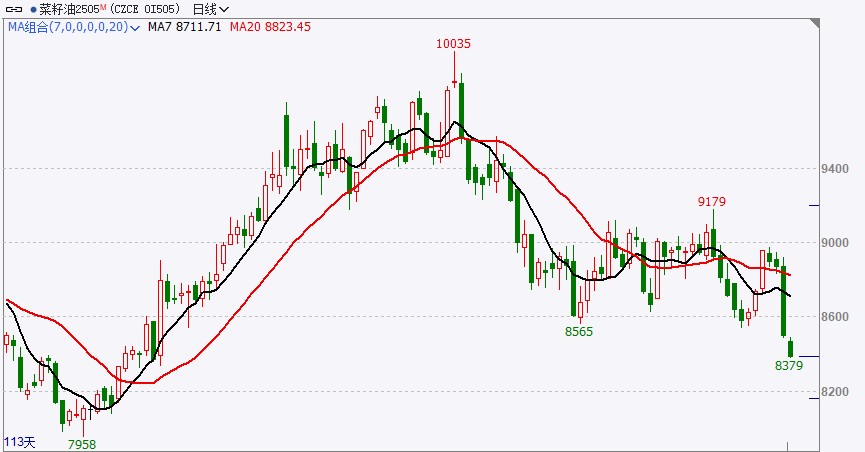1月16日,菜油期货主力2505合约增仓下跌,期价从前一天收盘的8873元/吨最低跌至8488元/吨。截止收盘,菜油2505合约报8498元/吨,基本靠近最低点,下跌了375元/吨,跌幅达4.37%,持仓量较昨日增加了39558手,增幅超15%。整体呈现出增仓下跌态势。江苏南通的菜油现货报价也从昨日的8995元/吨,下跌至8640元/吨,下跌了355元/吨。