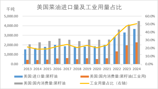美国农业部发布玉米、大豆和高粱的指导方针,以证明它们是“气候智能型”的,可能会用作生物燃料,获得税收和其他政府支持。本次生物燃料作物暂行规则中并没有包括油菜籽,使得市场担心此次油菜籽的缺席是否意味着油菜籽可能永远不会被批准纳入该规则,尽管此次也并没有取消油菜籽最终永久规则的资格。生物燃料作为油菜籽压榨主产物菜籽油需求的重要组成部分,此规定可能降低美国菜籽油的工业用量。从近几年美国菜油的进口情况来看,自2022年度,美国菜油进口量明显提升,从2021年年度进口量200万吨,到2024年年度进口量提升到366万吨,三年期间进口量增加166万吨,增幅达84%。工业用量占比也同步增加,从2021年的60.6万吨增加至2024年的226.8万吨,工业用量增加了166.2万吨,用量占比从20%附近提升至50%。我们可以发现美国菜油的进口增量基本源于工业用量的提升。另外,从进口来源国来看,近些年美国菜油的进口增量基本来自于加拿大,美国是加拿大菜籽油的主要出口目的地,而即将上任的美国总统唐纳德.特朗普威胁要征收25%的关税,可能会严重影响加拿大对美国的菜籽油出口。进而也进一步强化加拿大菜籽油对美需求坍塌的风险,使得加籽价格明显下滑,成本传导下,国内菜油价格也大幅走弱。