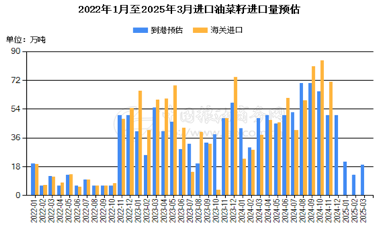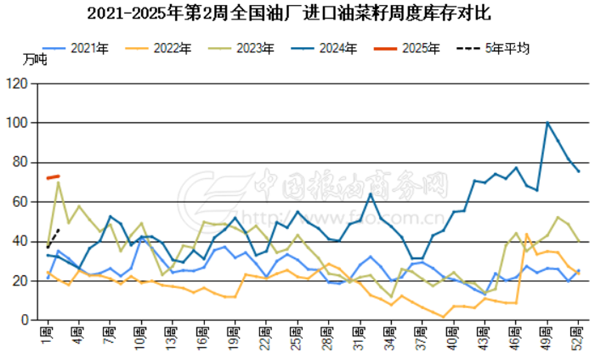 国内市场而言,中国粮油商务网监测数据显示,截止到2025年第2周末,国内进口油菜籽库存总量为73.2万吨,较上周的72.2万吨增加1.0万吨,去年同期为32.3万吨,五周平均为78.8万吨。现阶段油厂菜籽库存依旧处于近年来最高位置,短期国内菜油供应仍然较为充裕,且年前备货基本结束,需求端采购也明显放缓,供需维持宽松局面。不过,加籽反倾销调查仍未落定,市场买船仍显疲弱。据监测显示,1-3月进口菜籽到港预估分别为21万吨、13万吨、19万吨。进口量大幅下滑,菜油供应端压力也同步降低,或对远期市场价格有所支撑。